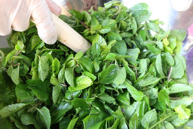 ミントの葉は潰して香りが出やすくしてから、麦汁に投入しています