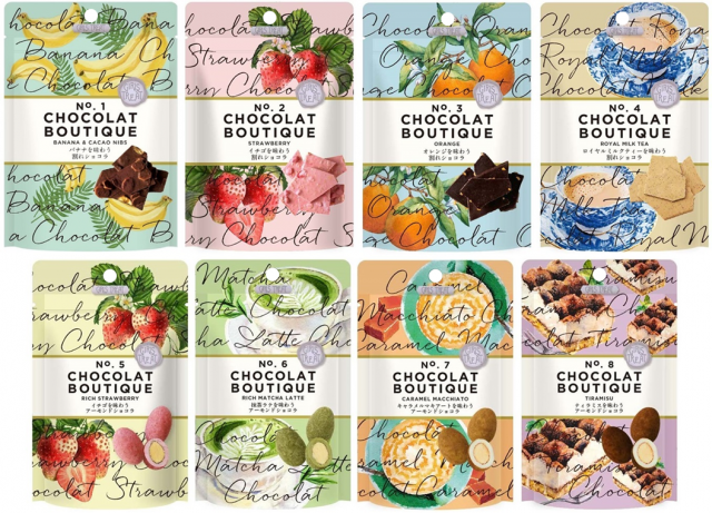 割れショコラ4種(バナナ/ストロベリー/オレンジ/ロイヤルミルクティー)、アーモンドショコラ4種(ストロベリー/抹茶ラテ/キャラメルマキアート/ティラミス)の全8種となっています。