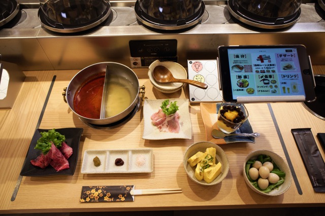 回転レーンで回るお肉や海鮮。選べる出汁。