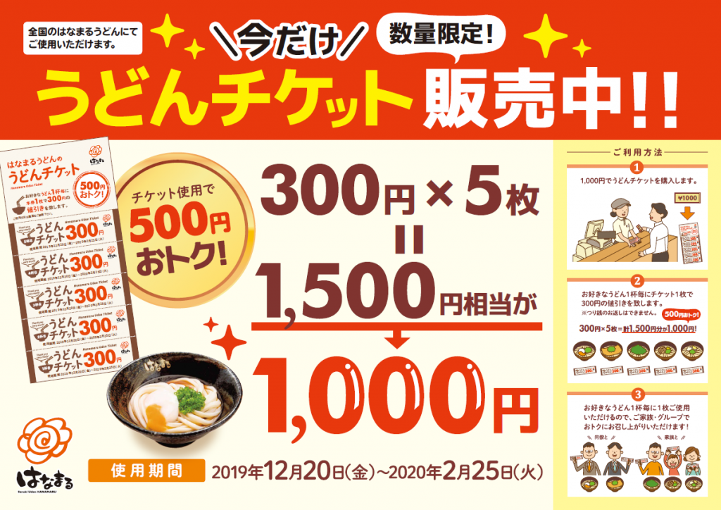 讃岐うどんチェーン「はなまるうどん」を展開する株式会社はなまる(本社:東京都中央区 代表取締役社長:門脇 純孝、以下はなまる)は、12月20日(金)より全国の「はなまるうどん」店舗にて、500円おトクにうどんが食べられる「うどんチケット」を販売します。