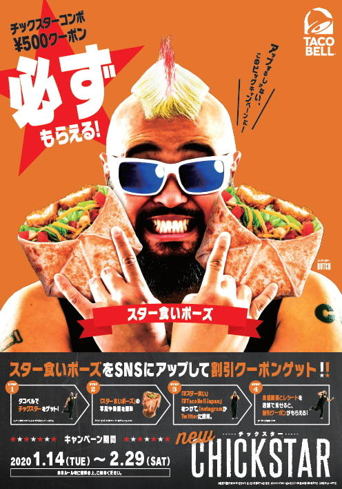 参加方法は、ポスターのBUTCHさん同様の人差し指・小指だけを立てチックスターを手に持つ、「#スター食い」ポーズを決め、その様子を撮影した画像を、「#スター食い #TacoBellJapan」のハッシュタグをつけて投稿ください。