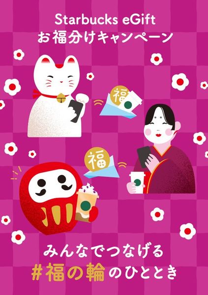 年末、年始のこのシーズンには、一年の御礼や新年のご挨拶など、大切な方にちょっとした気持ちを伝える機会が多くなるのではないでしょうか。このウィンターシーズンに、Starbucks eGiftでは「みんなでつなげる#福の輪 のひととき」と題して、eGiftを大切な方に贈ると、eGiftを貰った人に「#福の輪 チケット」が届き、eGiftを貰った人からまた他の方に無料でeGiftを贈ることができるStarbucks eGiftお福分けキャンペーンを実施します。福を大切な方と分かち合える、お福分け体験。みんなでつなげていく#福の輪 をStarbucks eGiftで楽しみませんか?