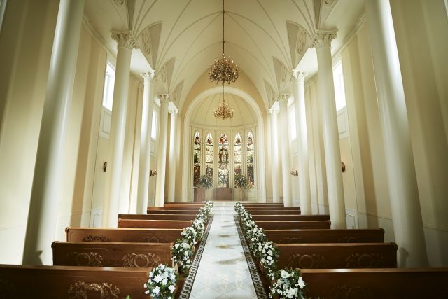 梅田・なんばから7分。ヨーロッパの教会を思わせる独立型大聖堂のたたずまいは、道行く人々をも魅了するほどのスケール感。本格派ゴシック様式の堂内では、1800年代イタリア製のステンドグラスと全長21mのバージンロードが荘厳な雰囲気を醸します。