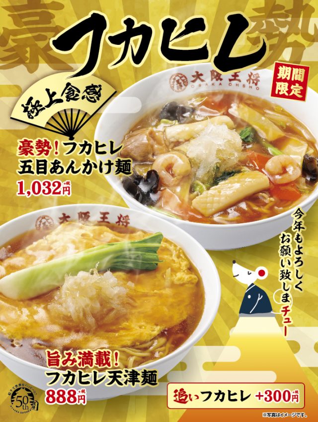 イートアンド株式会社(東京ヘッドオフィス:東京都品川区 代表取締役社長:仲田 浩康)は、2019年9月に創業50周年を迎えた「大阪王将」において、12月30日(月)から1月16日(木)までの期間限定で「年明けフカヒレ麺フェア」を開催します。