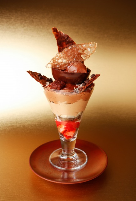 アイスクリームやチョコレートソース、トッピングのチュイルなど様々な食感と共に、カカオとチョコレートの味わいを存分に楽しめる、パレ ド オールの新定番のチョコレートパフェとなっています。