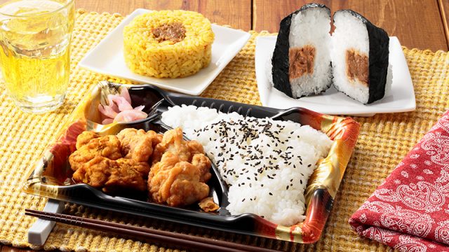 (左上:スパイス香る ドライカレーおにぎり 中央:相盛唐揚弁当 醤油・カレー 右上:しっかり具材おにぎり ツナ×カレー)
