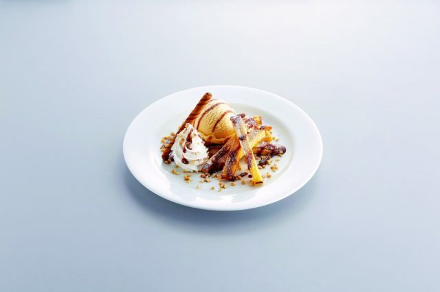 鹿児島県のさつまいもを使用したさつまいもスティックに、香ばしい焦がしバターキャラメルソースをたっぷりとかけたデザートです。温かいさつまいもスティックで程よく溶けたバニラアイスとの相性が抜群です。