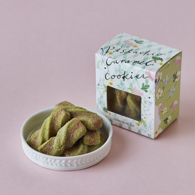 商品説明:ピスタチオ生地とキャラメル生地のクッキーを重ねてねじり、サクッとした食感に 焼き上げました。(9個)