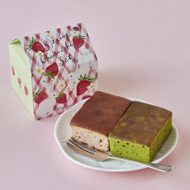 商品説明:大きな焼き型でしっとりと焼き上げたチーズケーキ。抹茶と苺、2つの味を楽しめるようになっています。