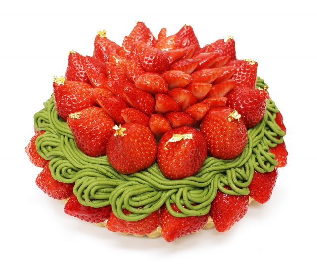「あまおう」を丸ごと飾り付け、八女抹茶を混ぜたマロンクリームと合わせました。濃厚な「あまおう」とほろ苦い抹茶の抜群のコンビネーションを楽しめます。