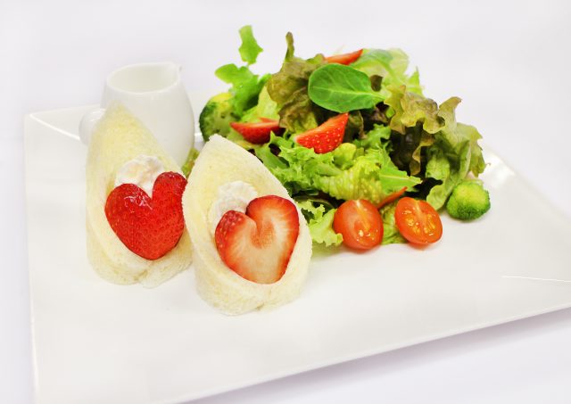 「あまおう」を飾り付けたボリュームたっぷりのサラダに、ハート型にカットした「あまおう」を生クリームと合わせたロールサンドが付いた、お得なプレートです。