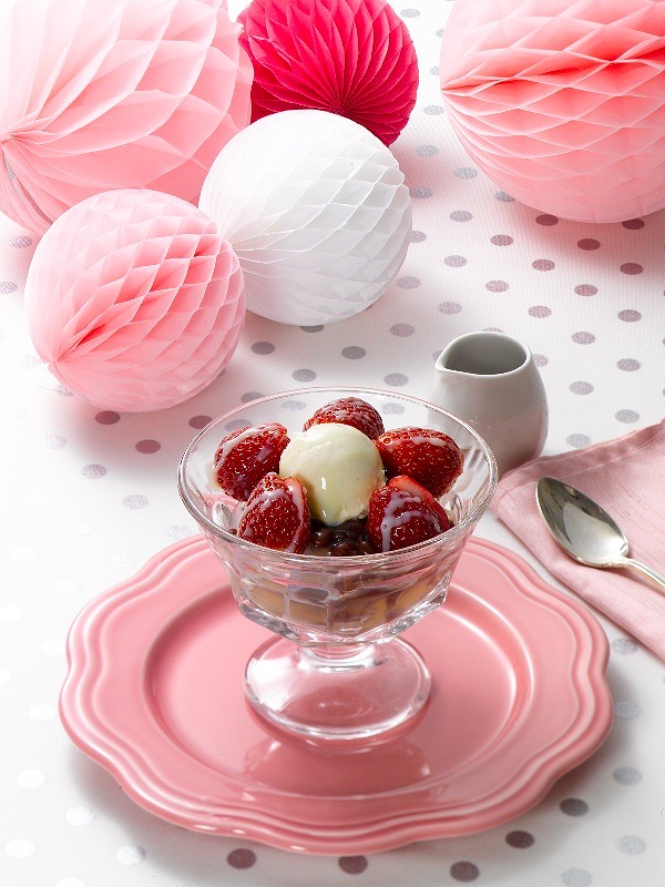 苺、十勝あずき、国産天草を用いた喉越しの良い寒天に、練乳をかけて。黒みつを添えた季節限定のクリームあんみつです。