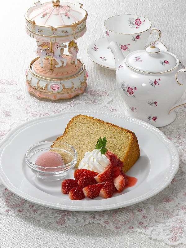 紅茶が香るシフォンケーキに、苺、やさしい甘さのホイップクリーム、苺のソルベを盛り合わせてあります。