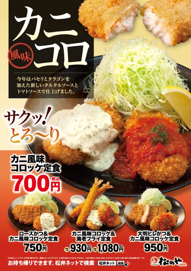 松屋フーズ(本社:東京都武蔵野市、代表取締役社長:瓦葺一利)では、とんかつ専門店の「松のや・松乃家・チキン亭」において、2020年1月15日(水)午後3時より、「カニ風味コロッケ」を新発売します。