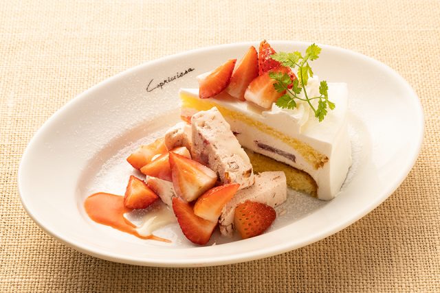 しっとり生クリームの定番ショートケーキと、いちごの甘酸っぱい果肉とナッツの食感が楽しい、ひんやり柔らかい口どけのセミフレッドを楽しむことが出来ます。