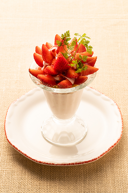 ぷるぷるのパンナコッタをベースに、サクサクの食感が楽しいグラノーラといちごのチーズクリームを重ね、フレッシュないちごをたっぷりのせて見た目も可愛らしいパフェに。