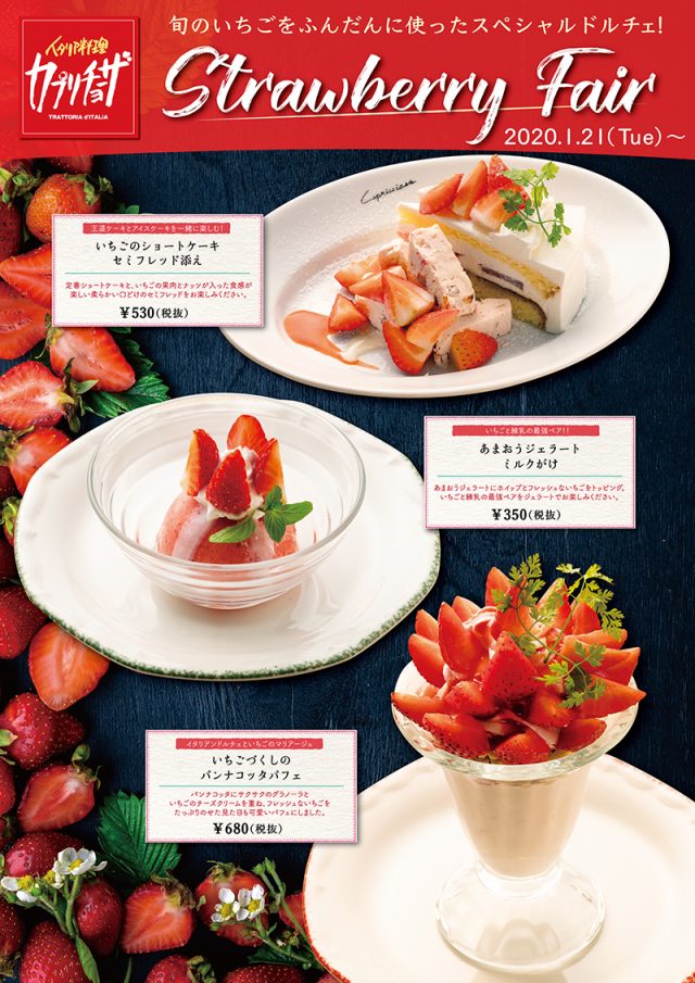 『いちごフェア』では、イタリアの伝統デザートをアレンジしながら、いちごのフレッシュな甘みと酸味を存分に楽しめる、見た目も華やかなスペシャルデザート3品を提供します。「カプリチョーザ」のオリジナリティがきらりと光るスイーツの数々で、春を先取りしてはいかがでしょうか。これから迎えるバレンタイン、ホワイトデーでのお食事にもおすすめです。