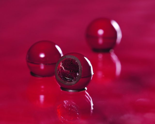 和菓子作家としてオーダーメイドの和菓子を制作・監修している坂本紫穗さんとのコラボ商品。つややかな赤ワインの錦玉羹を、深紅のチョコレートで包みました。深い想いをとじ込めたような、香り高い赤ワインとチョコレートの濃厚な味わいが特徴です。