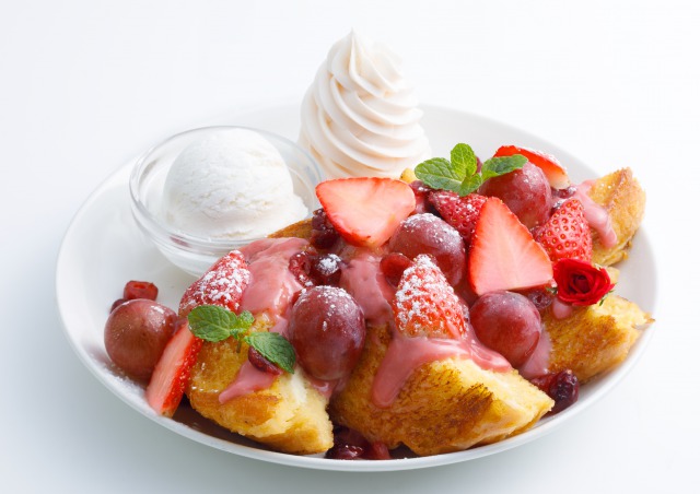 クリームチーズをサンドして焼き上げたフレンチトーストに、クランベリーをアクセントに、いちご・レッドグローブをトッピング。話題の第4のチョコレート“ルビーチョコ”を使用した甘酸っぱいソースをたっぷりかけて、味わえるようになっています。色鮮やかなプレートは女子の夢を詰め込んだ、女子に贈るバレンタインメニューとなっています。