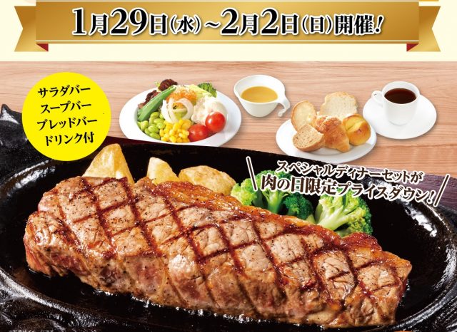株式会社アークミールが運営する『ステーキのどん』『ステーキハウスフォルクス』『しゃぶしゃぶすき焼どん亭』は、より多くのお客に足を運んでもらえるよう、1月29日(水)から5日間で「肉の日」を開催します。