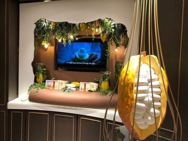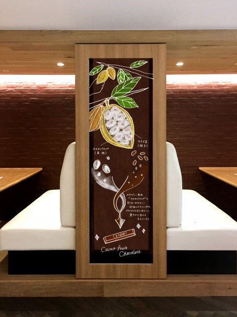 店内の至る所に、カカオの豆と果肉の写真やイラストを展示し、”カカオまるごと体験”を演出します。