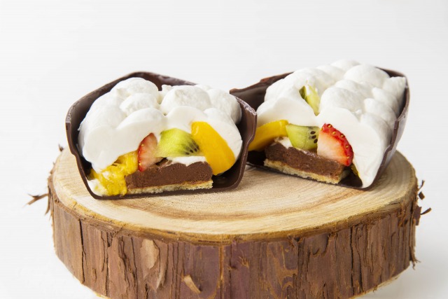 中には、苺、ラズベリー、ブルーベリー、グレープフルーツ、オレンジ、キウイ、マンゴーの7種のフルーツと、シェフ特製のビスキュイ、チョコレートクリームが隠されている。