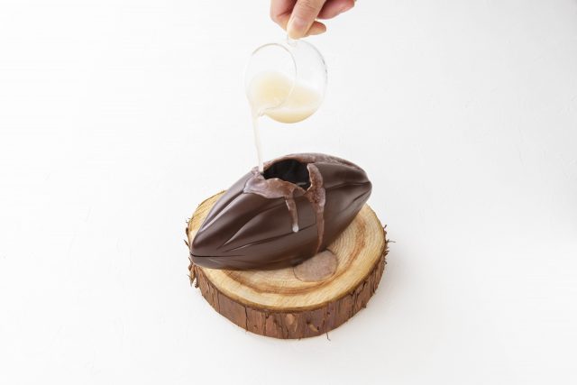温かいカカオパルプジュースをかけると、チョコレートがとろりと溶け出し、ムービージェニックな見た目になる。