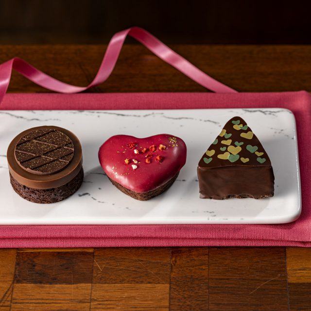 (右から)シャンパンが香る「ショコラ ワルツィン」、苺&ラズベリーの甘美な「ショコラハート」、カフェモカ風味の「ショコラロンド」。