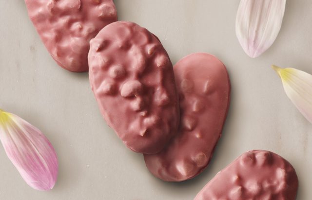 サクサクのサブレとナッツのフルーティーな味わいが特徴のルビーチョコでコーティング。