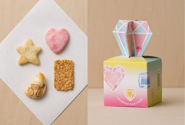 ダイヤモチーフのキューブ型ボックスに詰めたおせんべい。
