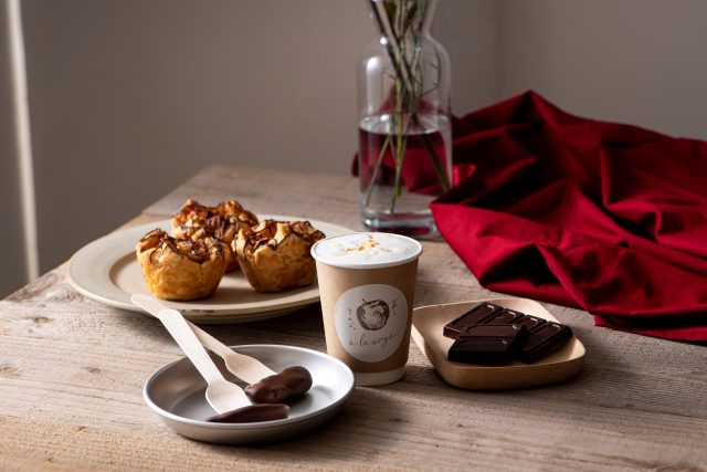 定番のりんごクランブルは、濃厚なショコラが中にも外にもたっぷり。りんごミルクにショコラを溶かしながら味わう楽しいドリンクも用意。