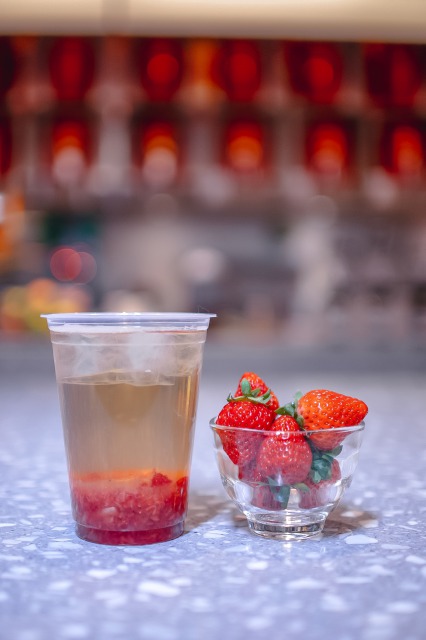 旬ウーロン茶(青茶)に旬の生イチゴをたっぷり使用し、果肉とお茶を一緒に楽しめるようになっています。