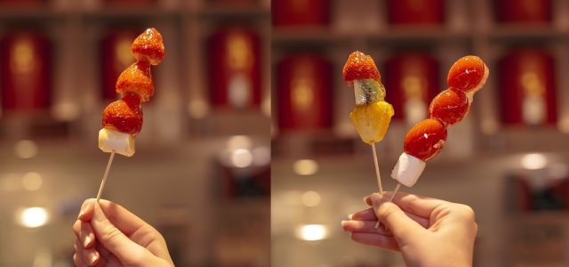 イチゴに飴をコーティングした、祭りの時期の定番。トマト飴は日本では珍しいですが、台湾ではポピュラーなスイーツです。飴の甘味にプチっとはじける程よい酸味がクセになります。