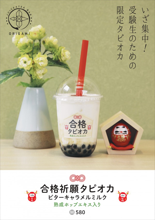 『合格祈願タピオカ ビターキャラメルミルク 熟成ホップエキス入り』は、受験シーズン真っただ中の学生を応援するために、「熟成ホップエキス」を素材として配合しjuice&tea bar ORIGAMI 広尾店 を運営するSEG が商品開発をした、新しいタピオカドリンクです。キャラメルとクリームの甘さにホップエキスのほろ苦さが程よく調和している大人味の商品となっています。