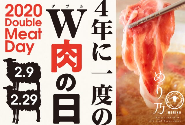 『めり乃』では、毎月29日に”肉の日キャンペーン”を実施しています。2020年の今年は、4年の1度のうるう年として、2月9日と2月29日の2日間、同キャンペーンを実施します。