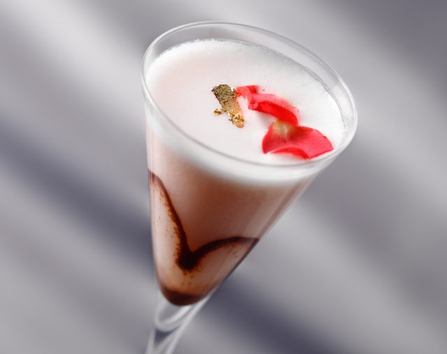 ホワイトチョコレートリキュールをベースに、ローズリキュールとリンゴジュースを合わせ、クリーミーでさっぱりとした味わいに仕上げました。チョコレートソースで描いたハートが素敵な「愛の日」を盛り上げてくれます。