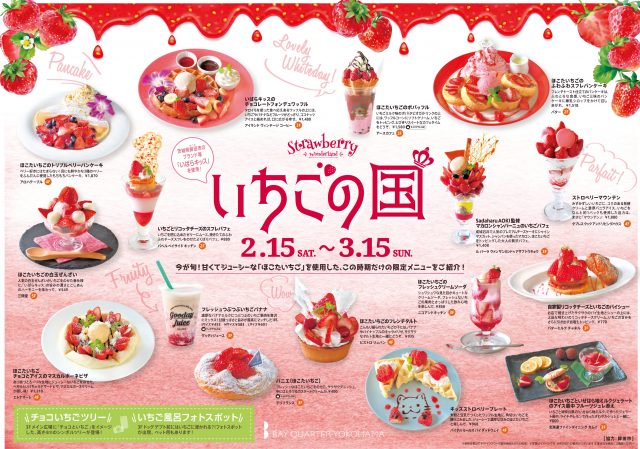 2月14日(金)までの「チョコの国」に続いて開催される横浜ベイクォーターの「いちごの国」では、茨城県鉾田(ほこた)市とコラボし、茨城発のブランドいちご「いばらキッス」を使った限定メニューを館内16店舗で提供します。