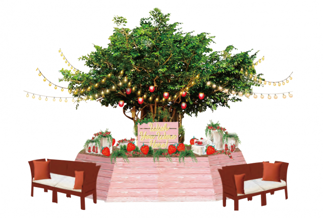 いちご型ランプやライトなどでデコレーションされた、かわいらしい「チョコいちごツリー」が登場。