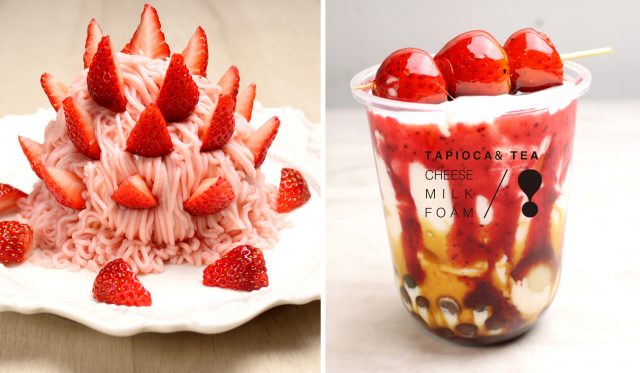 (左)こぼれいちごのモンブラン(右)黒糖タピオカいちごミルク いちご飴添え