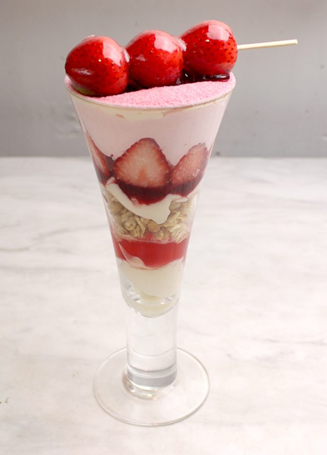 マスカルポーネクリーム、パンナコッタや グラノーラそれぞれの層が織りなす甘みや食感 のハーモニーとパリパリのいちご飴の 食感が味わえる『焦がし黒糖いちご パフェいちご飴添え』 ¥1,180(税抜)