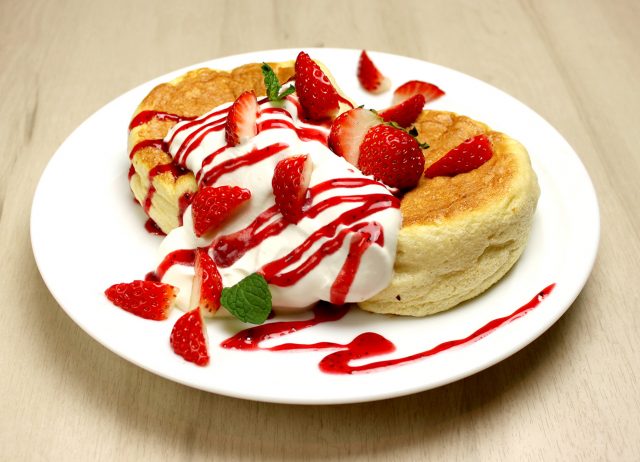 さわやかなカッテージチーズと濃厚 なゴーダチーズを生地に使用した ふわふわ食感の『こぼれいちごの スフレパンケーキ』 ¥780(税抜)