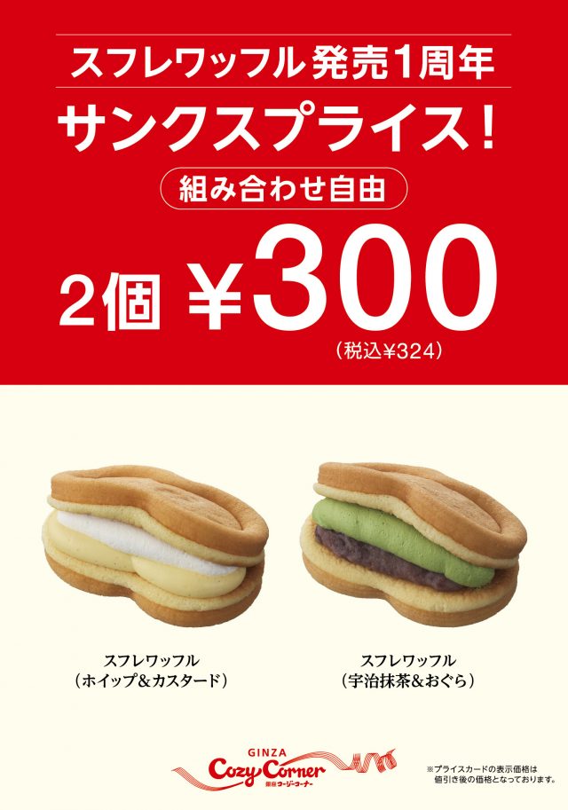 株式会社銀座コージーコーナー<代表取締役社長 山下訓央 東京都中央区>は、2020年2月15日〜2月18日まで、全国の生ケーキ取扱店舗で「スフレワッフル(ホイップ&カスタード)」「スフレワッフル(宇治抹茶&おぐら)」を「2個300円(本体価格)」で販売します。