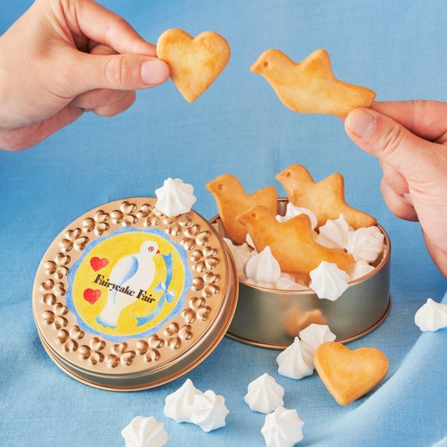 ミルク風味とバターの風味がふわっと優しく漂い、軽くてサクッとした食感で、昔懐かしの素朴なおいしさが口いっぱいに広がるミルクビスケット。口の中でふわっと溶けて爽やかさ広がるレモンヨーグルト味のメレンゲ菓子。「普遍的で純粋な愛」をテーマにアーティストの前田ひさえさんが描き下ろしたパッケージデザイン。