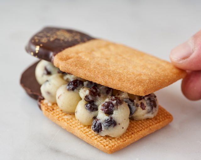 香り高く口溶けの良いこだわりの手作り「生バタークリーム」を使用したレーズン生バターサンド。より贅沢で濃厚な味わいに進化させ、リッチな味わいと食べ心地が新感覚のビスケットサンドとなっています。生クリーム入りのコク深いバタークリームに紅茶漬けレーズンを混ぜたレーズン生バタークリームを、ダークチョコレートがけした焼きたてのビスケットでサンド。コク深くリッチで重厚感たっぷりな食べ心地と味わいが楽しめるようになっています。1個からの単品購入も可能。コーヒーや紅茶との相性も抜群なので、ちょっぴり優雅なお茶の時間のおやつにぴったりとなっています。