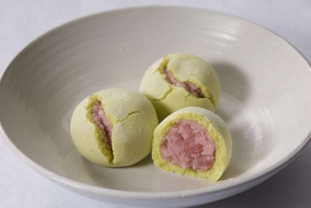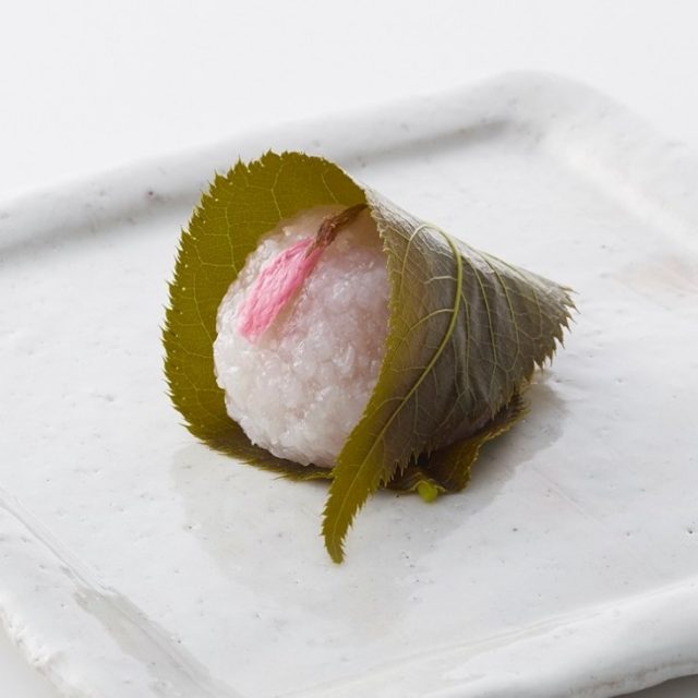 薄紅色に染めた白小豆餡を道明寺で包んださくら餅。販売:4月上旬まで