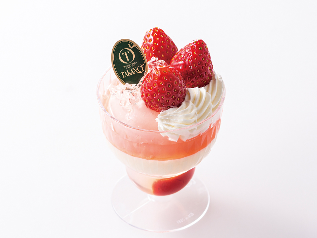 さくらジュレ、ミルクババロア、ピーチムース、さくらソースを重ねて彩りよく果実をかざりました。