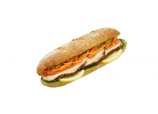 じっくりスモークし黒胡椒で味付けした国産パストラミチキンとキャロットラペを、ライ麦パンにサンドし焼き上げました。レモンスライスをトッピングしバジルソースも合わせることで、爽やかな酸味と風味が引き立ちます。