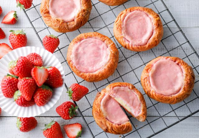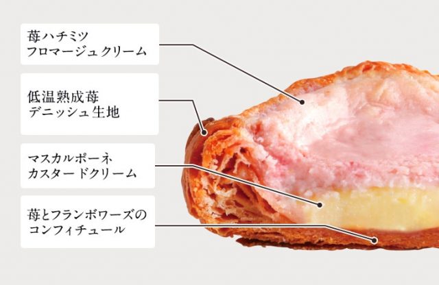 椿酵母を長時間熟成発酵させ、27層に織り込んだデニッシュ生地にも、特別に苺の風味をつけています。