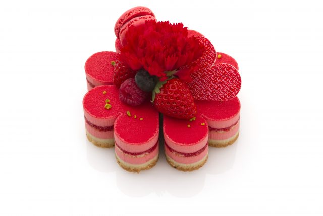 可愛らしいピンク色が目を引く「サヤネーション」。ホワイトチョコレートで仕立てたイチゴクリームと、コクのあるピスタチオクリームにサクサクと軽やかな食感のヘーゼルナッツのサブレを合わせました。デコレーションにはカーネーションとともにハート型のプレートを添えて。