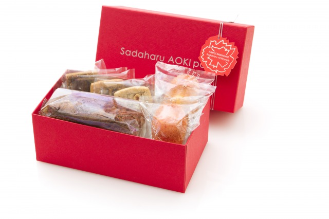カーネーションの可愛らしいチャームをかけた華やかな赤箱に、アオキ自慢の焼き菓子を詰め合わせた限定のアソート。アソート限定の「マドレーヌ ローズ」も加わり、華やかなラインナップで用意します。